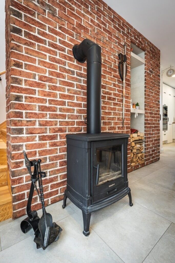 Během topné sezony je používáme zhruba obden. Oheň v obýváku máme rádi, je to nejen příjemné na pohled, ale i praktické. Stačí přiložit dvě dřevěné brikety a v domě je rázem o 2–3 °C víc. Stěna za kamny je vyzděna z cihel a při topení v kamnech naakumuluje teplo, které příjemně vyzařuje.