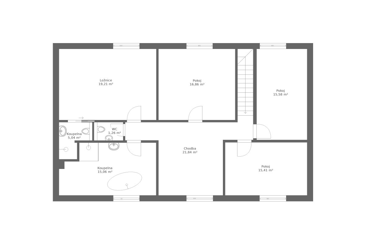 Rodinný dům s dispozicí 6+kk si manželé navrhli ve spolupráci se stavební firmou. Po vstupu hlavními dveřmi se ocitnete v prostorném zádveří, odkud vedou dveře na samostatné WC a také do největší místnosti celého domu, a to obývacího pokoje s kuchyňským koutem a jídelnou. Vedle obývacího pokoje se nachází místnosti, která slouží jako výměnek a na kterou navazuje koupelna s toaletou. Jak z výměnku, tak z obývacího pokoje je možné vyjít rovnou na terasu. Z obývacího pokoje vedou schody do patra. Tam se nachází prostorná chodba, ze které jsou přístupné tři dětské pokoje, další koupelna, samostatné WC a ložnice rodičů s vlastní koupelnou.